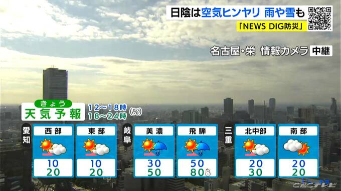 きょうは午後も晴れ間はありますが、夕方以降は岐阜県を中心に雨や雪が降るでしょう。愛知県や三重県でも所々で雨が降る見込みです。