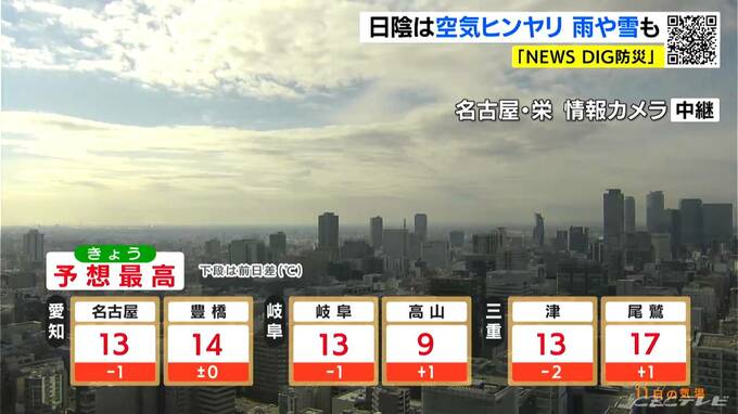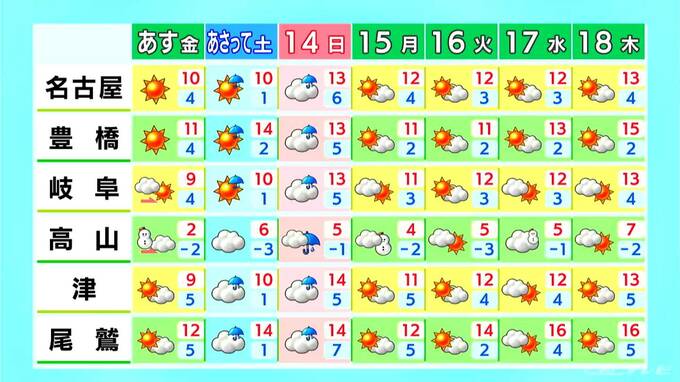 最高気温は名古屋や岐阜、津で13℃、高山で9℃くらいになるでしょう。風は穏やかですが、日陰では日中も空気がヒンヤリとしそうです。
