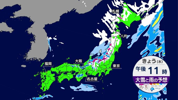 きょうは低気圧が北海道に近づく影響で、北海道は日本海側だけでなく太平洋側でも、まとまった雪になるでしょう。東北は日中、本降りの雨の所が多くなりますが、夜は次第に雪に変わる見込みです。また、北日本では…