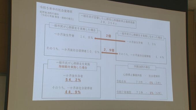 阿蘇広域消防本部の職員「心臓が止まってから血液が脳に行かなくなると、3〜5分で脳の細胞にダメージが残り、救命できても後遺症が残ることになります」