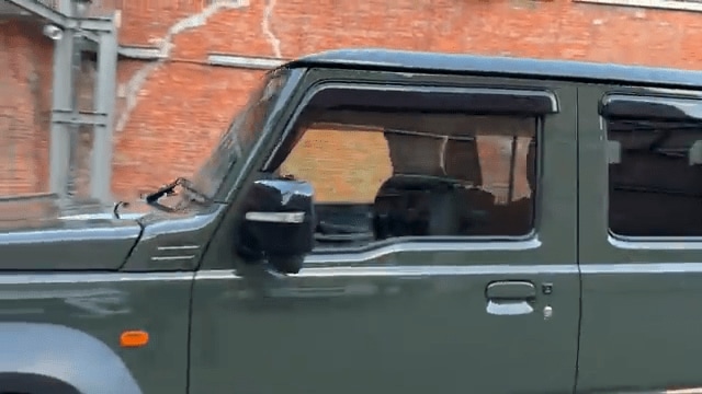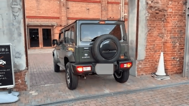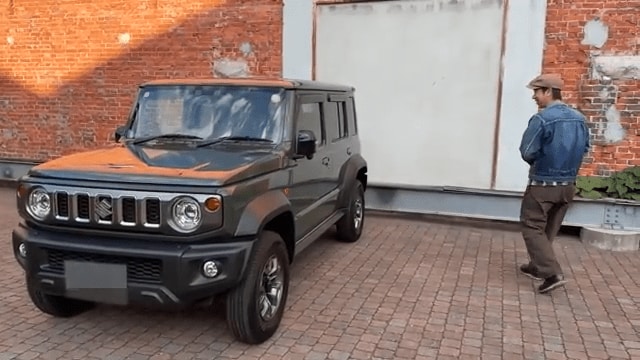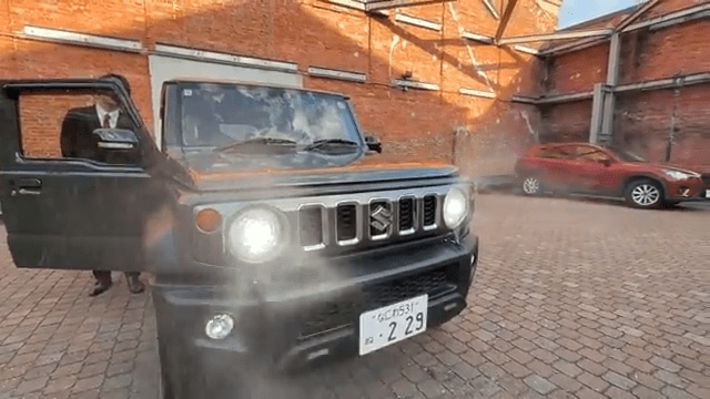 撮影者を焦らすように浜本さんがその車の前まで進むと、現れたのは深い緑色の角張った車体。浜本さんは “ジムニーノマド!” と得意気に声を上げました。