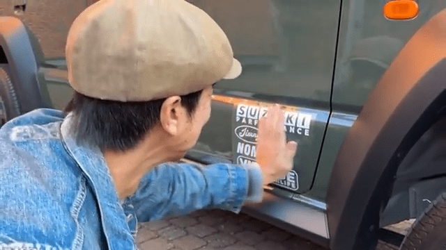 カスタムをどうするか思案する浜本さんは、取り急ぎ納車を記念して、友人が作ってくれたステッカーを車に貼ることにします。「ゆがんだらあきませんよ」とビビる撮影者を尻目に、風が吹き込む中、道具なしの一発で浜本さんはステッカーを貼り付けました。