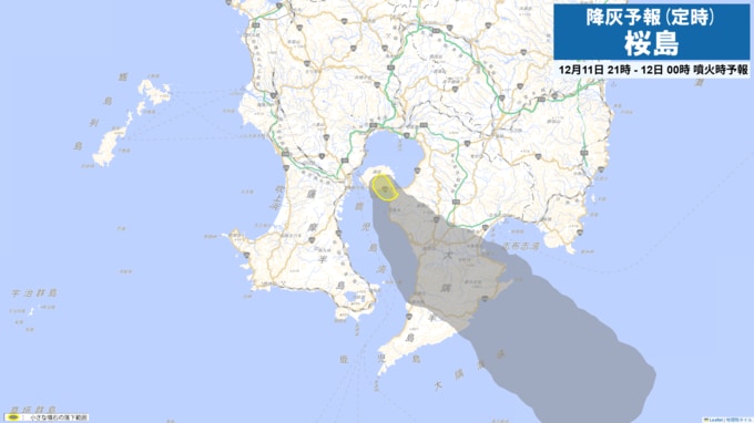 11日21時から24時までは火口から南東方向に降灰が予想されます。 11日15時から12日9時までに噴火が発生した場合には、以下の方向・距離に降灰及び小さな噴石の落下が予想されます。