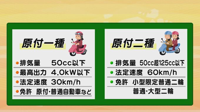 原付バイクには2種類あり、排気量50㏄以下・法定速度30キロの「原付一種」と、排気量が50cc超・125㏄以下で、法定速度60キロの「原付二種」。