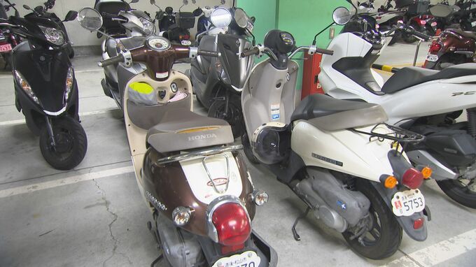 松山市役所にある無料駐輪場を訪れると、原付バイクがズラリと並んでいます。