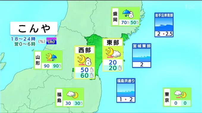 東部は晴れ間も出ますが、昼過ぎまでは雪が降りやすく、平地でも所々で雪が積もるでしょう。西部は夜まで断続的に雪が降り、山沿いでは大雪や着雪に注意が必要です。西寄りの風が強く吹くため、強風やふぶきにも注意してください。海上では暴風雪警報が出される可能性もあります。