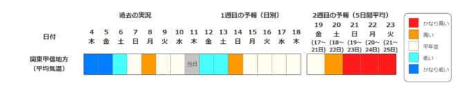 関東甲信地方の気温は、向こう2日間程度は寒気の影響で低いですが、その後は、寒気の影響を受けにくいため平年並か高く、19日頃からはかなり高くなる可能性があります。