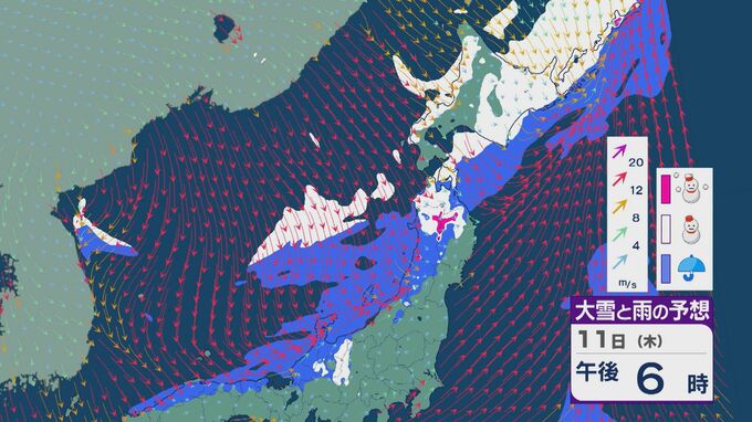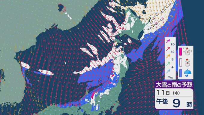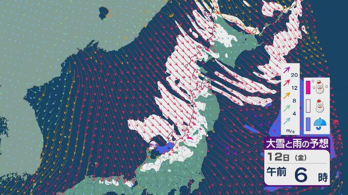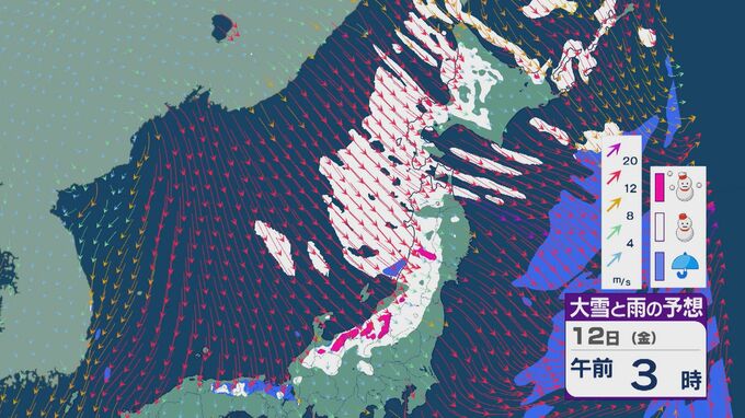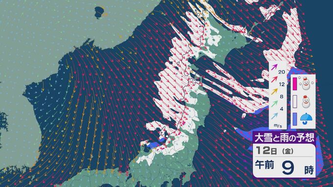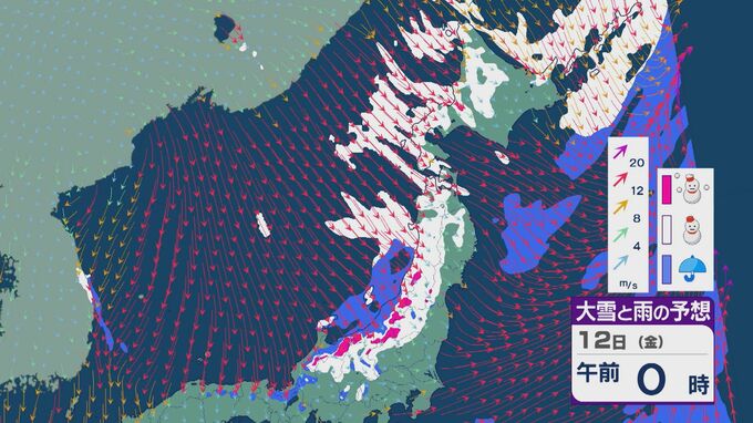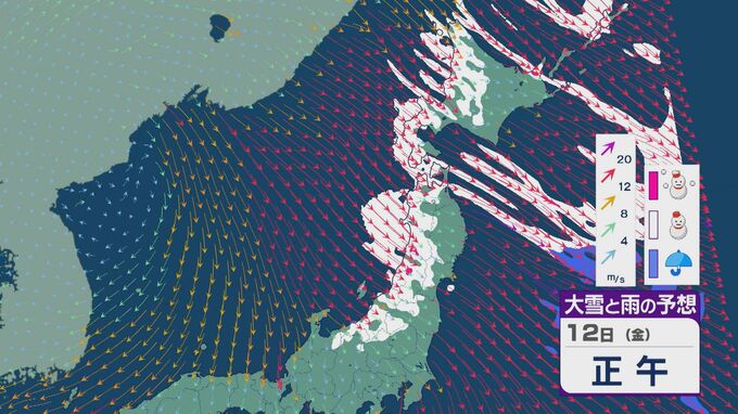 12日も、未明は山地で大雪なるところもありそうです。午前中は東北の日本海側では広い範囲で雪が降る見込みです。また、北西の風も強く、東北では陸上でも15メートルの強い風が吹くでしょう。