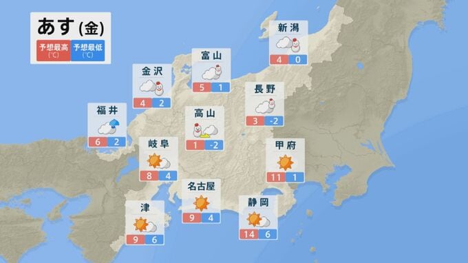 北陸も雪の降るところが多くなりそうです。金沢の予想最低気温は2度、予想最高気温は4度と平年より6度も低いでしょう。最高気温は最も寒い時期よりも低く、日中も冷え込みそうです。