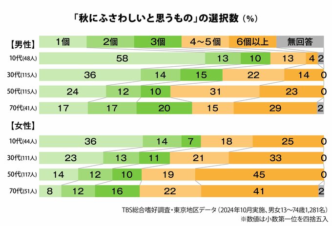 こうした傾向は男女ともに見られますが、同年代で男女を比べると、男性より女性のほうが選択数が多い様子。つまり、女性のほうが男性より「あれも秋らしい、これも秋らしい」と連想するものが多い人が多く、それは年代が高まるほど増えるということ。裏を返せば、若年男性が「秋」で思いつくのは紅葉か、せいぜいハロウィンくらいという感じ。