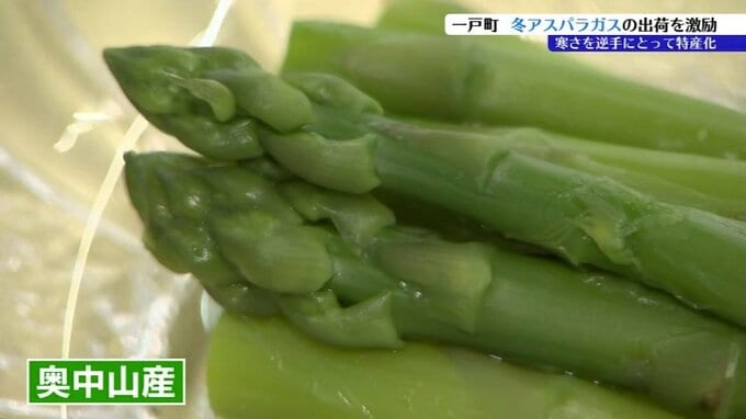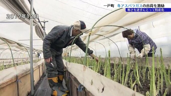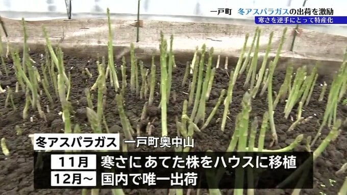 一足早く寒さが訪れる一戸町の奥中山地域では、11月に畑で寒さにあてたアスパラガスをハウスで促成栽培します。