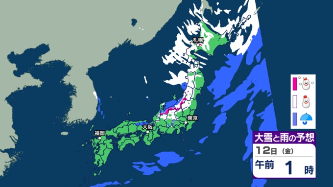 11日夜から12日にかけて、天気は「激しい雨」から「雪」へと急激に変化する予想です。北日本や東北の日本海側を中心に、冬の嵐となる見込みです。