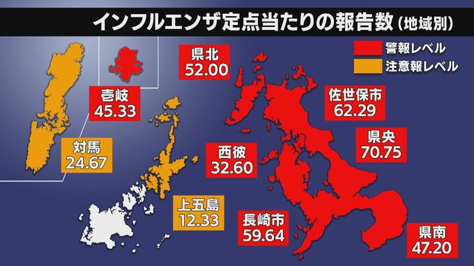 地域別に見ると長崎市や佐世保市のほか、新たに西彼地区を加えた7つの地区が警報レベルに。対馬・上五島の2つの地区が注意報レベルとなっています。直近の2週間は患者数の伸びが緩やかになってきていますが、長崎県は年末年始に向けて人の行き来が増えるとして引き続き警戒を呼びかけています。