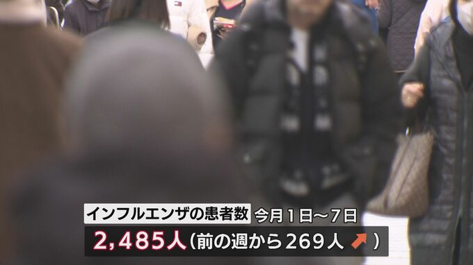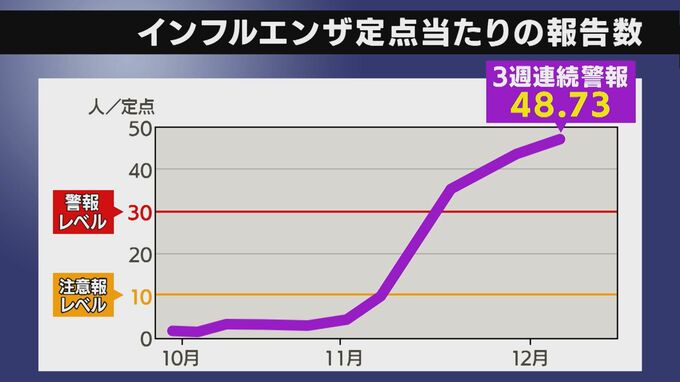長崎県内51の医療機関から12月7日までの1週間に報告されたインフルエンザの患者数は2485人で、前の週と比べ269人増加しました。1医療機関当たりの報告数は警報レベルの「30」を大きく超える「48.73」で、長崎県内は3週続けて「流行警報レベル」となっています。
