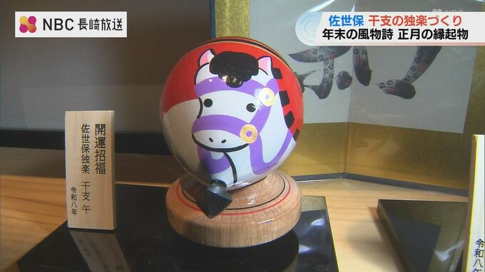 正月用の縁起物として人気が高い干支を描いた佐世保独楽づくりがいま、最盛期を迎えています。細い絵筆を使って表情を描き入れていきます。来年の干支「うま」を描いた「佐世保独楽」です。山本優子さん「この干支…