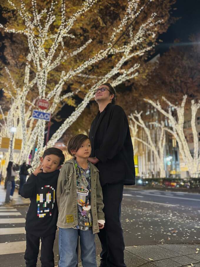投稿された画像では、ライトアップされた木々が並ぶ夜の街角で、黒い装いの中村獅童さんが、息子の陽喜くん・夏幹くんと佇む様子が見て取れます。