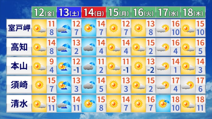 土曜日から日曜日にかけては低気圧の影響で平野部を中心にまとまった雨となりそうです。来週は日差しが届く日が多くなるでしょう。気温は平年並みとなりそうです。
