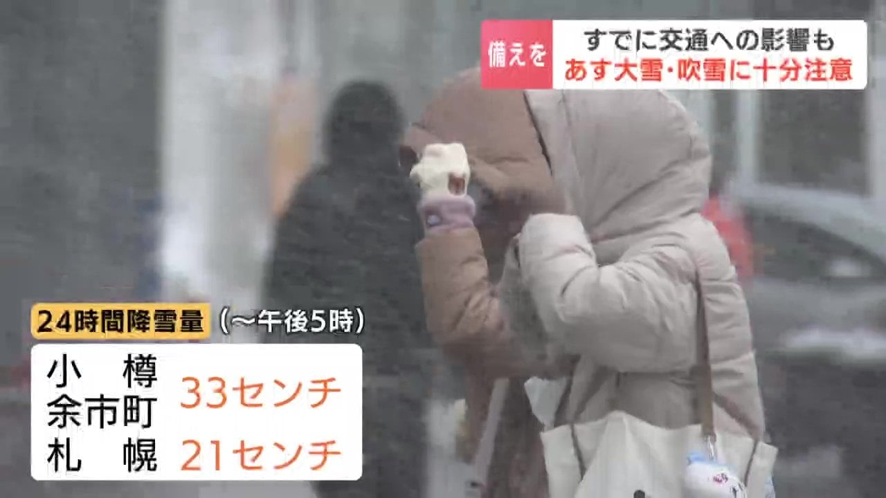 北海道付近を通過する低気圧の影響で、日本海側を中心に雪の降り方が強まり、午後5時までの24時間に小樽市と余市町で33センチ、札幌市でも21センチの雪が降りました。