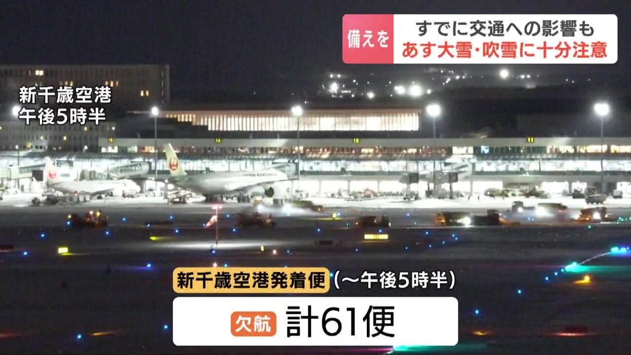 交通への影響も出ていて、空の便は新千歳空港を発着する61便が欠航、JR函館線も普通列車2本が運休しています。