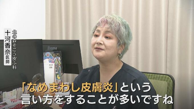 「『なめまわし皮膚炎』という言い方をすることが多いですね。唇が乾燥して、乾燥したところを湿らそうと思って、舌で唇の上の部分をなめてしまうので、丸い赤い筋ができたりするのが典型的な症状になります」