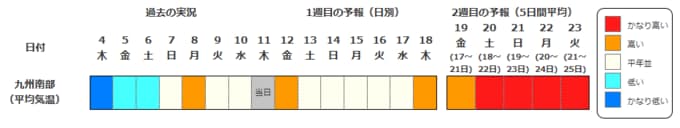 九州南部の向こう2週間の気温は、寒気の影響を受けにくいため平年並か