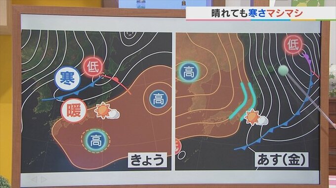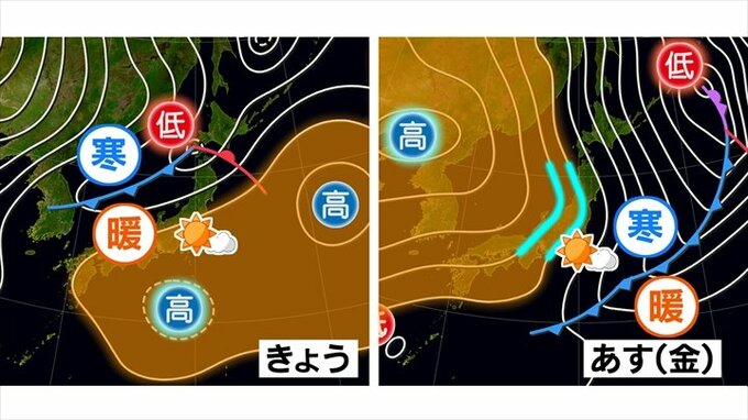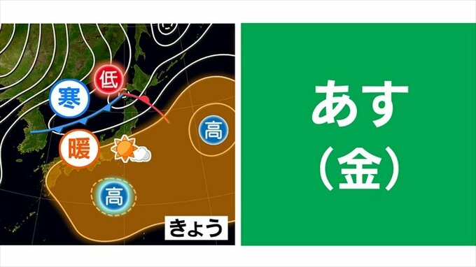 きょう高気圧に覆われて晴れてさらにこの低気圧からのびる前線、これは空気の境目となります。