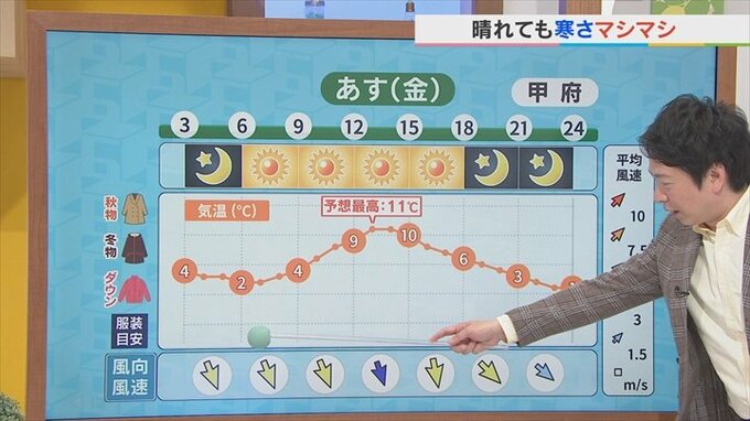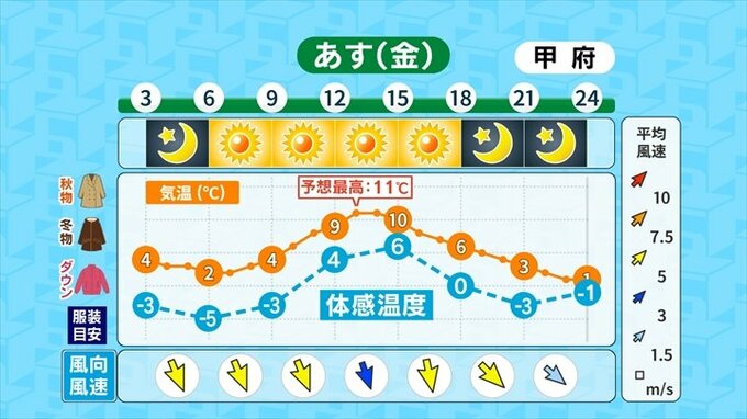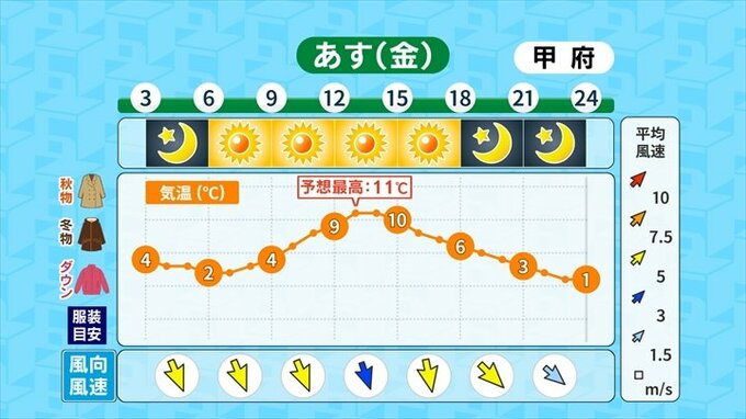 その気温の変化を甲府のピンポイント予報で見ていきますと、まず天気は晴れとなります。予想最高気温は11℃できょうと比べて2℃低い予想です。