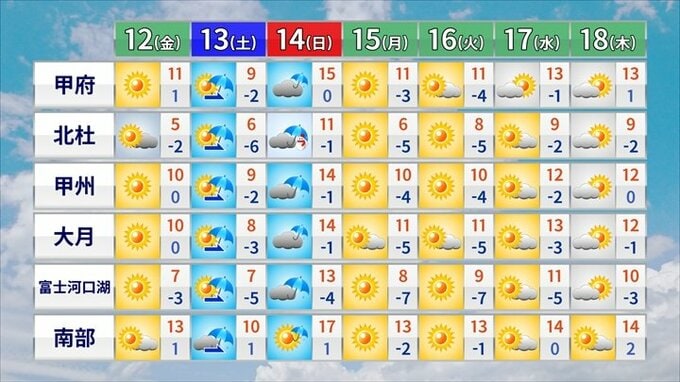 ただ、天気が回復した後の14日午後、15日月曜日は風が強まる見通しでして、来週の中頃は冷え込みも強まり、甲府でも水道管の凍結のおそれがあります。
