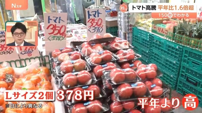 東京・品川区の青果店「八百屋あおば」は、地元では安いことで評判ですが、トマトはLサイズ2個で378円と平年より高く販売しています。(※日により異なる)