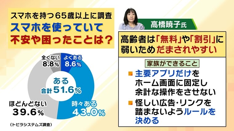 高橋氏は「高齢者は『無料』や『割引』という言葉に弱いためだまされやすい」と指摘。家族ができることは、▽主要アプリだけをホーム画面に固定し、余計な操作をさせない、▽怪しい広告・リンクを踏まないようルールを決める、としています。