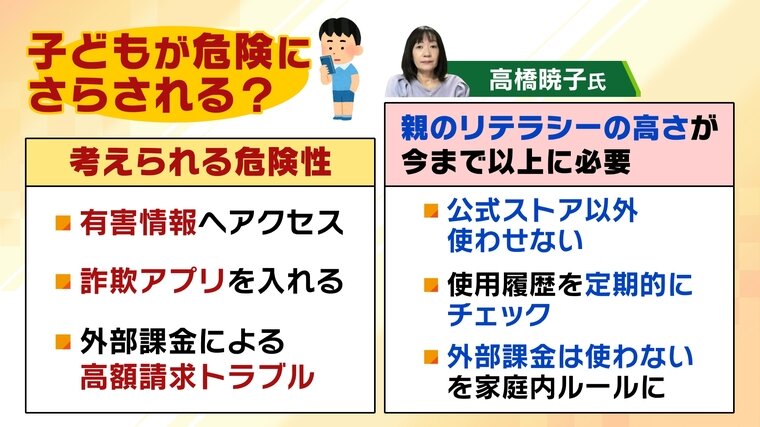 ITジャーナリスト・高橋暁子氏は「親のリテラシーの高さが今まで以上に必要」だと指摘しています。具体的な対策として、▽公式ストア以外を使わせない、▽使用履歴を定期的にチェック、▽『外部課金を使わない』を家庭内ルールに、ということを挙げています。