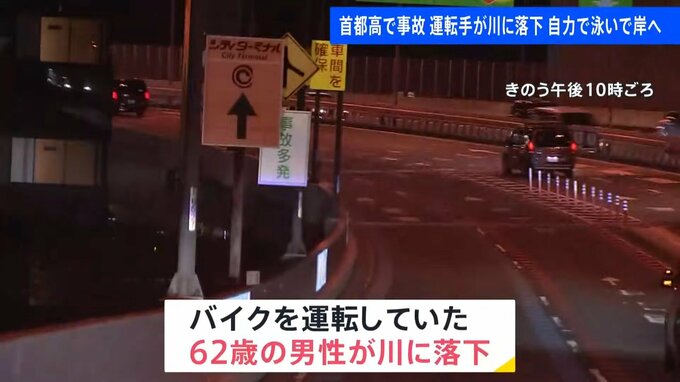 きょう(11日)夜、首都高速道路で乗用車とバイクの事故があり、バイクを運転していた62歳の男性が川に落下しました。男性は自ら泳いで岸に向かい、病院に運ばれましたが、命に別状はないということです。