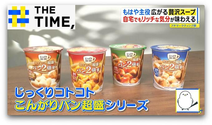 カップ入りスープの「じっくりコトコトこんがりパン 超盛」シリーズ(248円※参考価格)は、パンの量を約2倍にすることで“食事の主役”に。