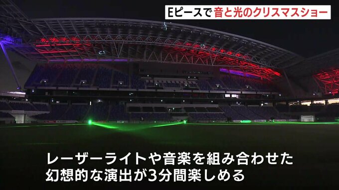 サンフレッチェ広島が企画したこのイベントは、スタジアムの最新設備を活用した新しい試みで、11日夜、報道陣に公開されました。スタジアム全体がチームカラーの紫やクリスマスカラーの光に包まれ、レーザーライトや大型ビジョン、音楽を組み合わせた幻想的な演出を3分間楽しむことができます。