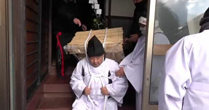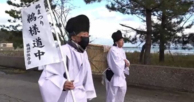 鵜はカゴに移され、神の化身「鵜様」となって、2025年の鵜捕部を務める家に運ばれました。