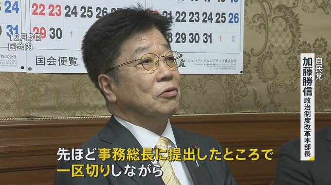 一方で、自民の加藤勝信・政治制度改革本部長は「我々としてのミッションという意味においては、先ほど事務総長に提出したところで一区切りしながら、これから成立を目指す過程の中で各党に法案の中身を説明するなどにおいては、その役割をしっかり果たしていきたい」と述べ、法案提出自体で一つの区切りを迎えたという認識を示した。