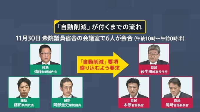 維新からは遠藤敬・総理補佐官、藤田文武・共同代表、阿部圭史・衆院議員が、そして自民からは萩生田光一・幹事長代行、木原稔・官房長官、尾﨑正直・官房副長官が参加し、維新側は法案に「自動削除」要項を盛り込むことを要求した。