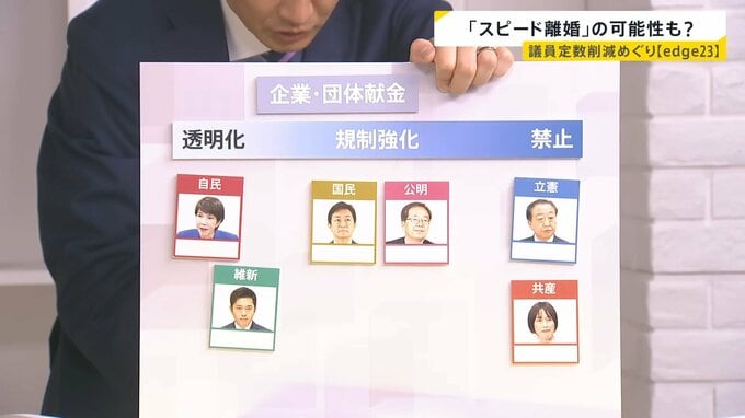 企業・団体献金の規制と議員定数削減、どちらにも後ろ向きな自民党が「あえてゆっくり審議を進めているのでは」との見方も出ていて、こうした状況に維新の幹部からは「議員定数削減ができなければ連立離脱も辞さない」という声も出ている。