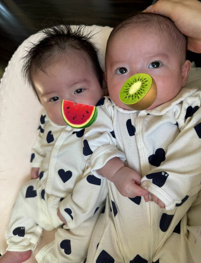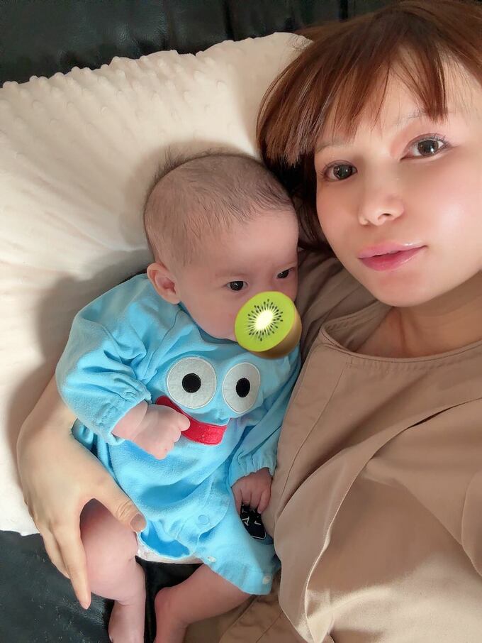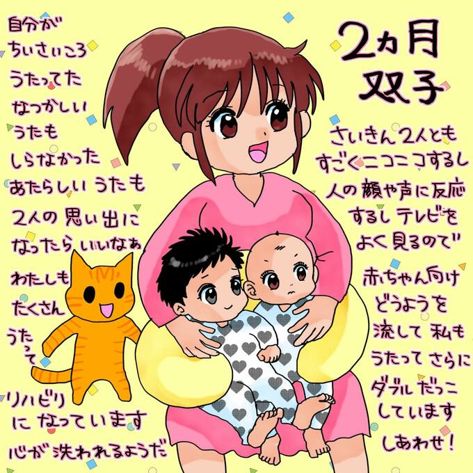 また、最近の双子の様子については「最近すごくニコニコ笑顔してくれます」と報告。「テレビ画面もよく見るから、歌詞付きのどうよう(童謡)を流してわたしも歌ってます」と、双子に歌を聴かせていることを明かしました。
