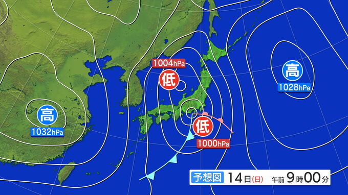 14日(日)の午前9時には、南側の低気圧は静岡沖に、北側の低気圧は能登半島の北の日本海へと発達しながら進む見込みです。