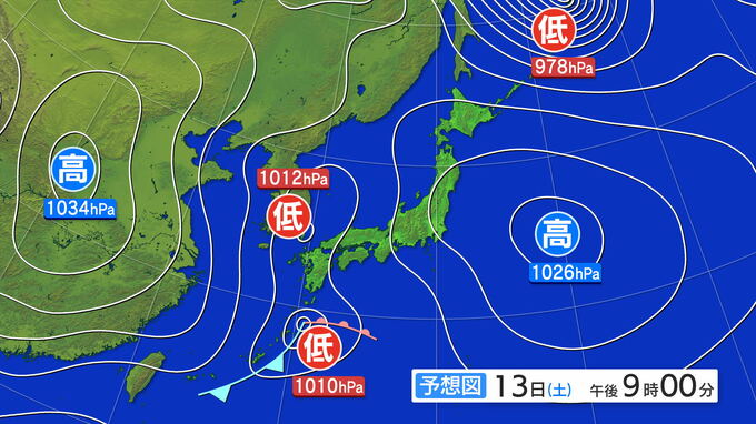 13日(土)午後9時の予想天気図です。奄美付近と九州の北の海上にそれぞれ低気圧があり東北東へと進む見込みです。