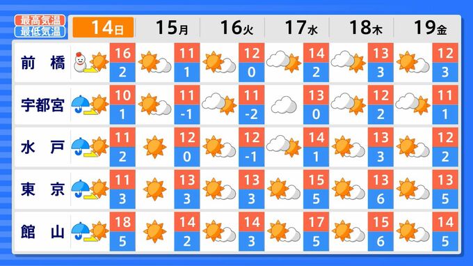 【東京首都圏でも雪の可能性】13日夜~14日にかけ関東・東海に“雪の影” 14⽇~15⽇頃は発達する低気圧の影響で北~東⽇本で荒れた天気「警報級の⼤雪や⼤⾬」恐れも【大雪シミュレーション・週間天気】 青森テレビ 2025年12月12日(金) 15:25 国内 【関東】全国各地の天気予報・週間天気 ♦大雪・雨・風の予想シミュレーション ♦全国各地の天気予報・週間天気 ♦記事を最初から見る