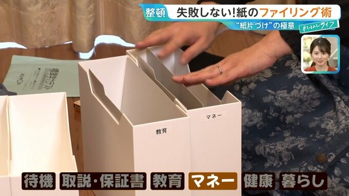 正面にシールを貼って、「暮らし」「健康」「マネー」「教育」「取扱説明書&保証書」「待機」にジャンル分けします。