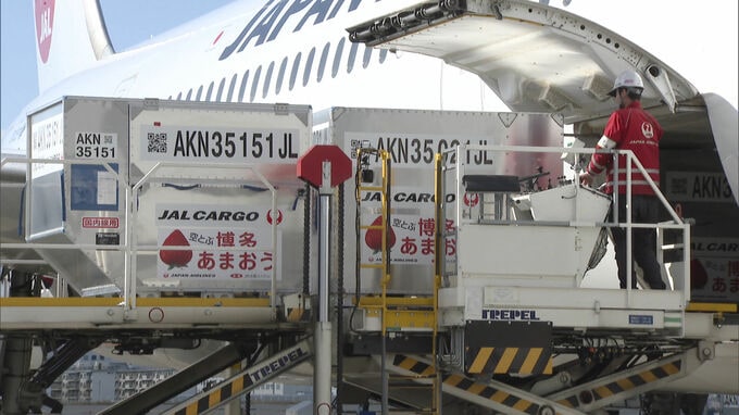 12日午前、福岡空港では日本航空の羽田空港行きの便に県南部で昨夜収穫されたあまおう20キロ、1720パックが積み込まれました。