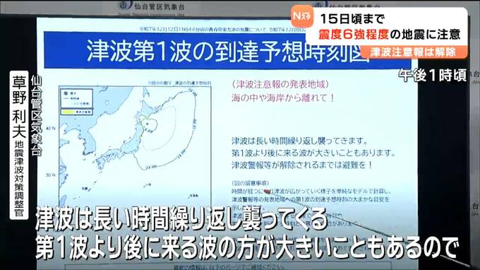 12月12日の津波注意報を受け、仙台管区気象台は12日午後、記者会見し、12月15日頃までは最大震度6強程度の地震に注意するよう呼びかけました。