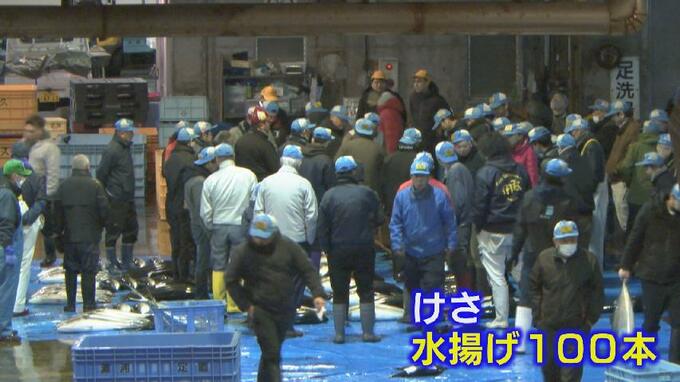 氷見漁港でのけさのブリの水揚げはわずか100本。