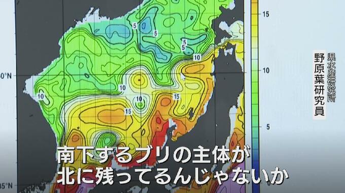 「北の方の水温配置を見てみますと暖かい水温がまだ北の方にも広く広がっていて、南下するブリの群れの主体が、まだ北の方に残ってるんじゃないかと」