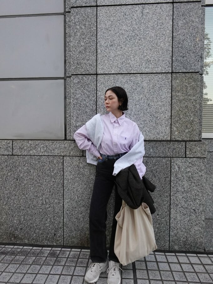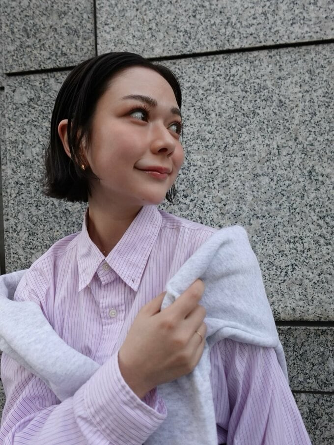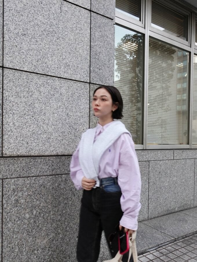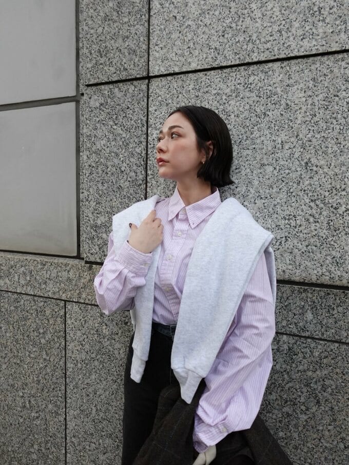 村重さんは、「ヘイリービーバーまだ日本にいるかな?と思いながら選んでみました!」と伝えつつ、淡いピンク地のストライプシャツに生地二枚重ねと思われるデニムのパンツとグレーのスニーカーを合わせ、古着の淡いモスグレーのトレーナーを肩に羽織るコーデを披露。
