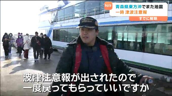 「津波注意報が発表され、船に乗り込もうとしていた人たちが一斉に戻ってきています」
