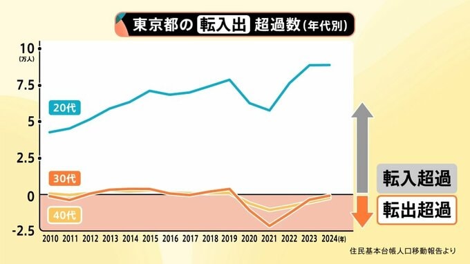 実は、住民基本台帳人口移動報告による「東京都の転入出超過数(年代別)」によりますと、「子育て世帯が30代以上になると転出超過の側になる」(=子育てしていく世代が東京都から出て行ってしまう)というデータがあります。東京都にとっては、将来を考えると失いたくない層です。